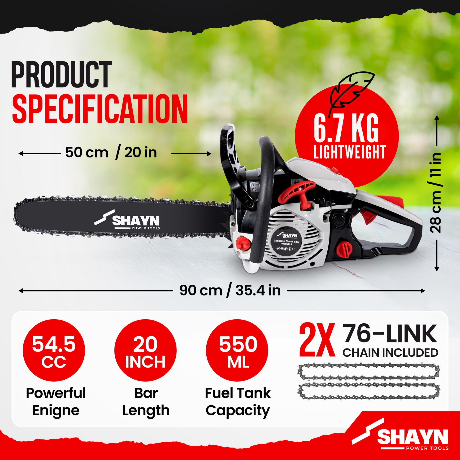 - ✅ [AUTOMATIC LUBRICATION & EASY START SYSTEM]: Our petrol chainsaw 20 inch model is built for easy use, with a smooth recoil starter for reliable ignition and an automatic chain oiler to keep everything running efficiently. The included funnel and measuring bottle make fuel mixing fast and mess-free, ideal for any gasoline chainsaw user.